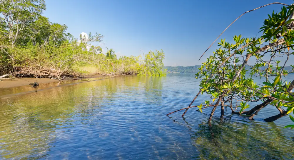 Nous faisons une pause sur une plage bordée de cocotiers et de mancenilliers, ces arbres toxiques dont la sève peut provoquer de graves brûlures. Prudence de mise ! Un singe hurleur nous observe depuis une branche, visiblement agacé par notre présence. Plus bas, des Tombouroux voyageurs courent sur la mangrove, pinces en avant.
