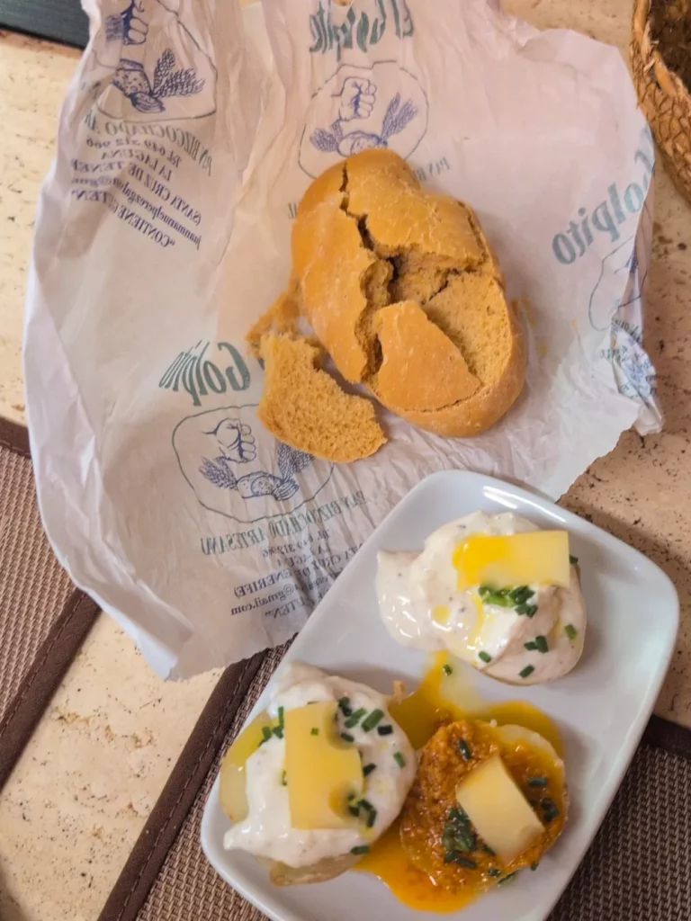 Voici donc notre 3ème restaurant recommandé : un restaurant de pêcheurs, El Mero Pancho, une valeur sûre, on y a mangé 3 fois… On sélectionne directement le poisson sur l’étal ou sur la pancarte. En quelques minutes, il passe à la plancha et arrive dans l’assiette. En alternatives végétariennes, on teste les pimientos de Padrón et le gofio, une farine de céréales grillées héritée des Guanches. Nourrissante, facile à conserver, elle fait encore partie intégrante de la cuisine canarienne. Il y a aussi de l’halloumi rôti dans du sirop de dattier (oui oui, le fruits des palmiers). Et des papas arrugades, des pommes de terre cuites dans de l’eau très salée. On les déguste avec des sauces typiques : du mojo rouge, piquant, ou du mojo vert, à a la coriandre.